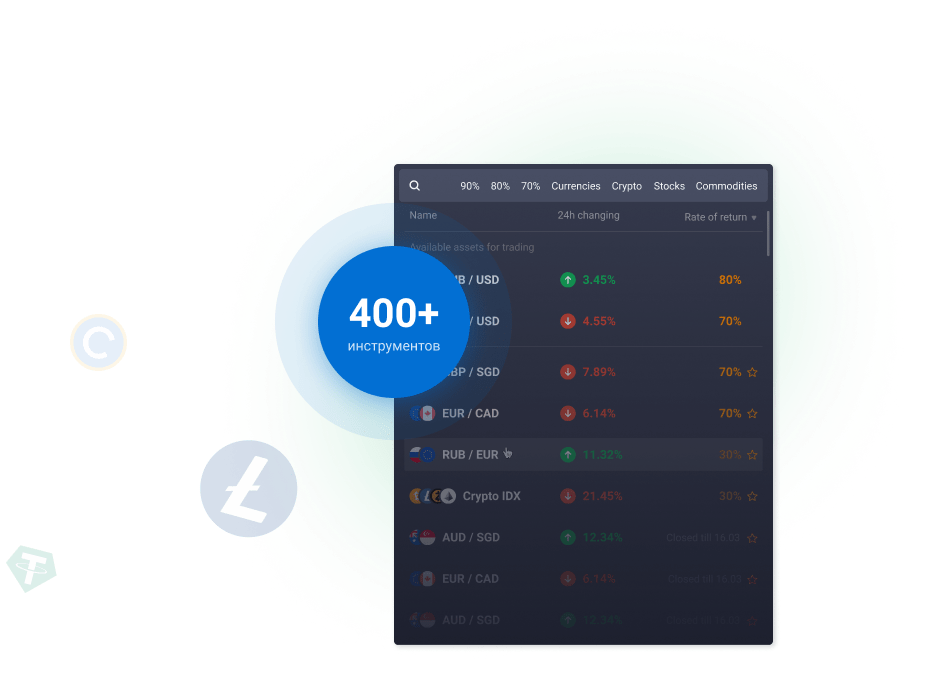 Join usAssets suitable for any trader: currency, commodities, stocks, cryptocurrencies.